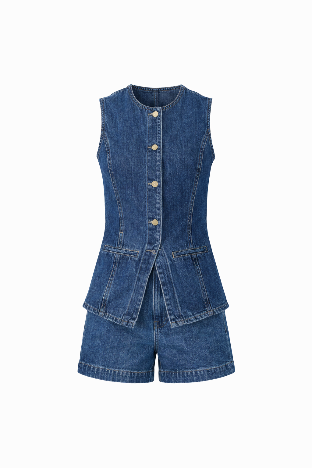 El conjunto Jara es la opción ideal para quienes buscan un look casual con un toque refinado. Su diseño combina una blusa sin mangas con botones y unos shorts de tiro alto, creando una silueta estilizada que mezcla comodidad, frescura y sofisticación. El top, con escote redondo y cierre frontal, ofrece un acabado limpio y minimalista, mientras que sus costuras verticales realzan la figura y los bolsillos simulados aportan un sutil aire utilitario. Los shorts, de cintura alta, definen la silueta y alargan las piernas, complementados con costuras clásicas y bolsillos funcionales que unen estilo y practicidad.