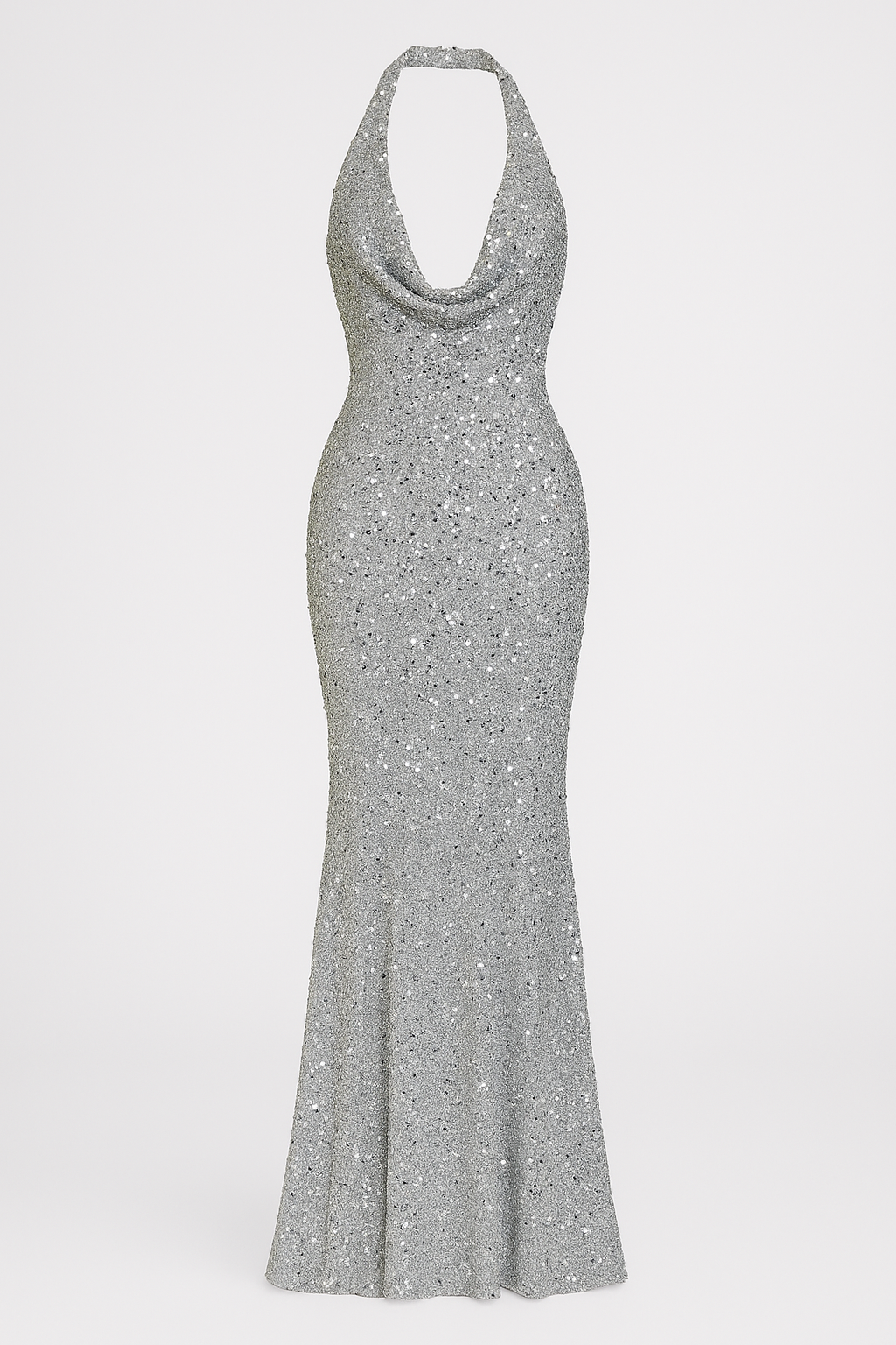 Disponible en color plateado , este vestido está pensado para brillar con luz propia . Combínalo con un maquillaje luminoso y un peinado pulido para completar un look de alto impacto .